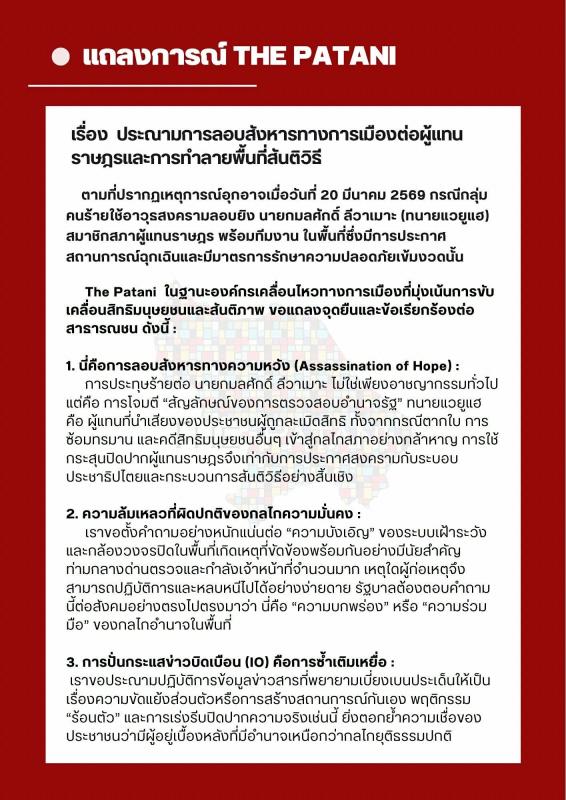 ปัตตานี (20 มีนาคม 2569) – กลุ่ม The Patani ออกแถลงการณ์ประณามเหตุลอบสังหาร นายกมลศักดิ์ ลีวาเมาะ (ทนายแวยูแฮ) ส.ส. และนักสิทธิมนุษยชนคนสำคัญ ชี้เป็นการ "ลอบสังหารความหวัง" และทำลายกระบวนการสันติวิธี พร้อมตั้งข้อสังเกตความผิดปกติของมาตรการความมั่นคงในพื้นที่