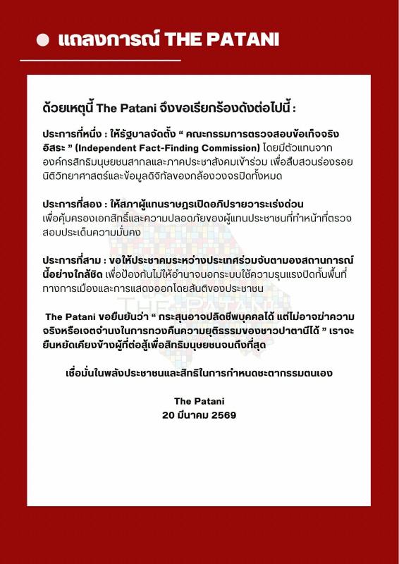 The Patani ในฐานะองค์กรเคลื่อนไหวทางการเมืองที่มุ่งเน้นการขับเคลื่อนสิทธิมนุษยชนและสันติภาพ ขอแถลงจุดยืนและข้อเรียกร้องต่อสาธารณชนดังนี้: