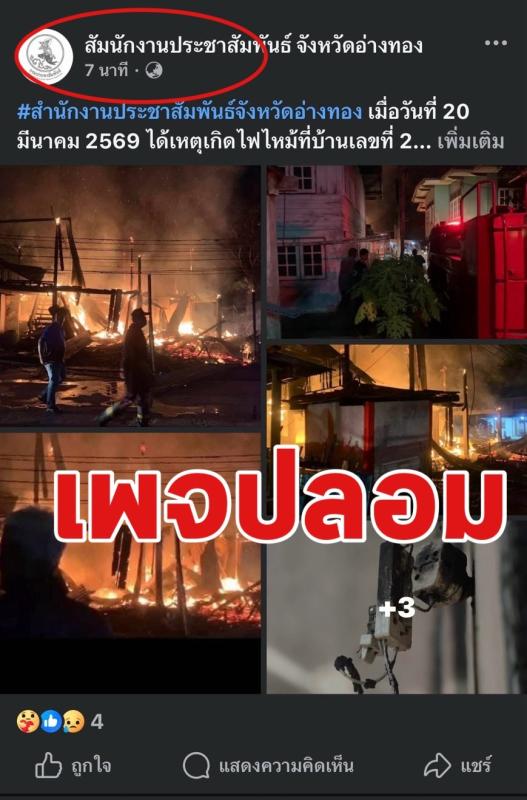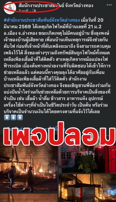 📌มีบุคคลปลอมเพจ สนง.ประชาสัมพันธ์จังหวัดอ่างทอง แล้วโพสต์ภาพไฟไหม้ เพื่อขอรับบริจาค อย่าหลงเชื่อ เพราะนี่คือ ของปลอม