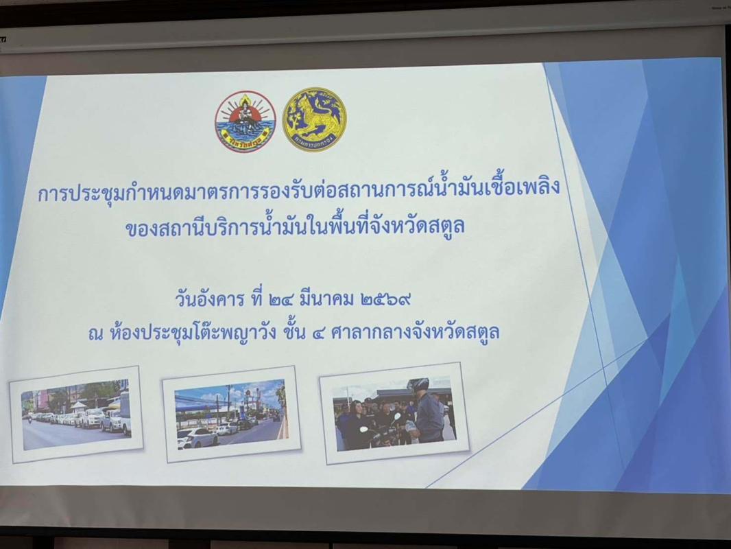 เมื่อวันที่ 24 มีนาคม 2569 เวลา08.30น.ที่ห้องประชุมโต๊ะพญาวัง ชั้น 4 ศาลากลางจ.สตูล นายคณิต คงช่วย ผวจ.สตูล เป็นประธานการประชุมกำหนดมาตรการรองรับสถานการณ์น้ำมันเชื้อเพลิงในพื้นที่ โดยมีนายดำรงศักดิ์ แก้วดวง รองผวจ.สตูล นายจิรพงค์ ใจคะจัด. พลังงานจ.สตูล.นายพิบูลย์ รัชกิจประการ ว่าที่สส.ระบบบัญชีรายชื่อพรรคภูมิใจไทย นายสัมฤทธิ์ เลียงประสิทธิ์ นายกอบจ.สตูล นางสายช่อ อังศุพานิช พานิชย์ จ.สตูล พร้อมหน่วยงานเกี่ยวข้องร่วมประชุม การประชุมดังกล่าวเพื่อติดตามสถานการณ์ทั้งด้านปริมาณสำรอง แหล่งจัดหา และราคาน้ำมันอย่างใกล้ชิดที่ประชุมได้รับทราบสถานการณ์น้ำมันเชื้อเพลิงทั้งในระดับประเทศและพื้นที่ ซึ่งได้รับผลกระทบจากสถานการณ์ความขัดแย้งในตะวันออกกลาง รวมถึงการดำเนินการตามคำสั่งนายกรัฐมนตรีที่ 3/2569 และประกาศกระทรวงมหาดไทยที่เกี่ยวข้อง พร้อมพิจารณาผลการสำรวจสถานีบริการน้ำมันในพื้นที่ช่วงวันที่ 21 – 23 มีนาคม 2569 ข้อมูลแหล่งจัดหาน้ำมัน ปริมาณสำรอง และระดับราคาจำหน่ายในปัจจุบัน โดยพบว่า จังหวัดสตูลมีความต้องการใช้น้ำมันในระดับสูง ขณะที่สถานีบริการมีจำนวนจำกัด ประกอบกับความกังวลของประชาชน ส่งผลให้ความต้องการเพิ่มขึ้นในบางช่วงเกือบ 4 เท่าตัว อย่างไรก็ตาม จากข้อมูลและการบริหารจัดการในภาพรวม ยืนยันว่ายังมีปริมาณน้ำมันเพียงพอ และสามารถบริหารจัดการให้รองรับความต้องการได้ทั้งนี้จ.สตูลขอความร่วมมือจากประชาชนและสื่อมวลชน ร่วมกันเผยแพร่ข้อมูลข่าวสารที่ถูกต้อง และช่วยกันสร้างความเข้าใจ เพื่อลดความตื่นตระหนก พร้อมขอให้เติมน้ำมันเท่าที่จำเป็น เพื่อให้มีการกระจายใช้อย่างทั่วถึงและเพียงพอสำหรับผู้ที่จำเป็นต้องใช้งาน โดยจังหวัดได้มีการประสานขอเพิ่มโควต้าน้ำมันเข้าสู่พื้นที่สตูลเพิ่มเติม เพื่อให้การบริหารจัดการเป็นไปอย่างต่อเนื่องและมีประสิทธิภาพ