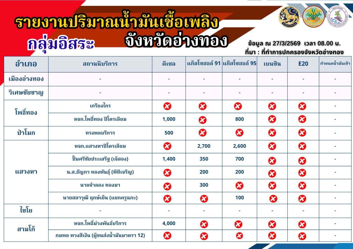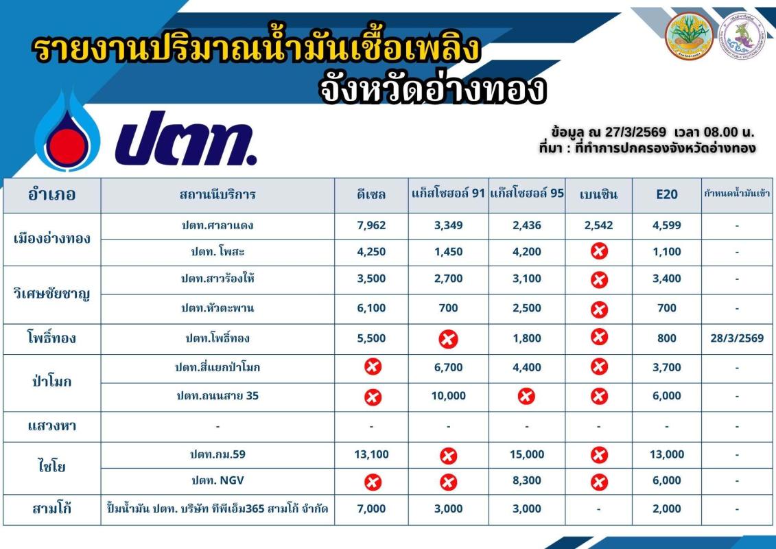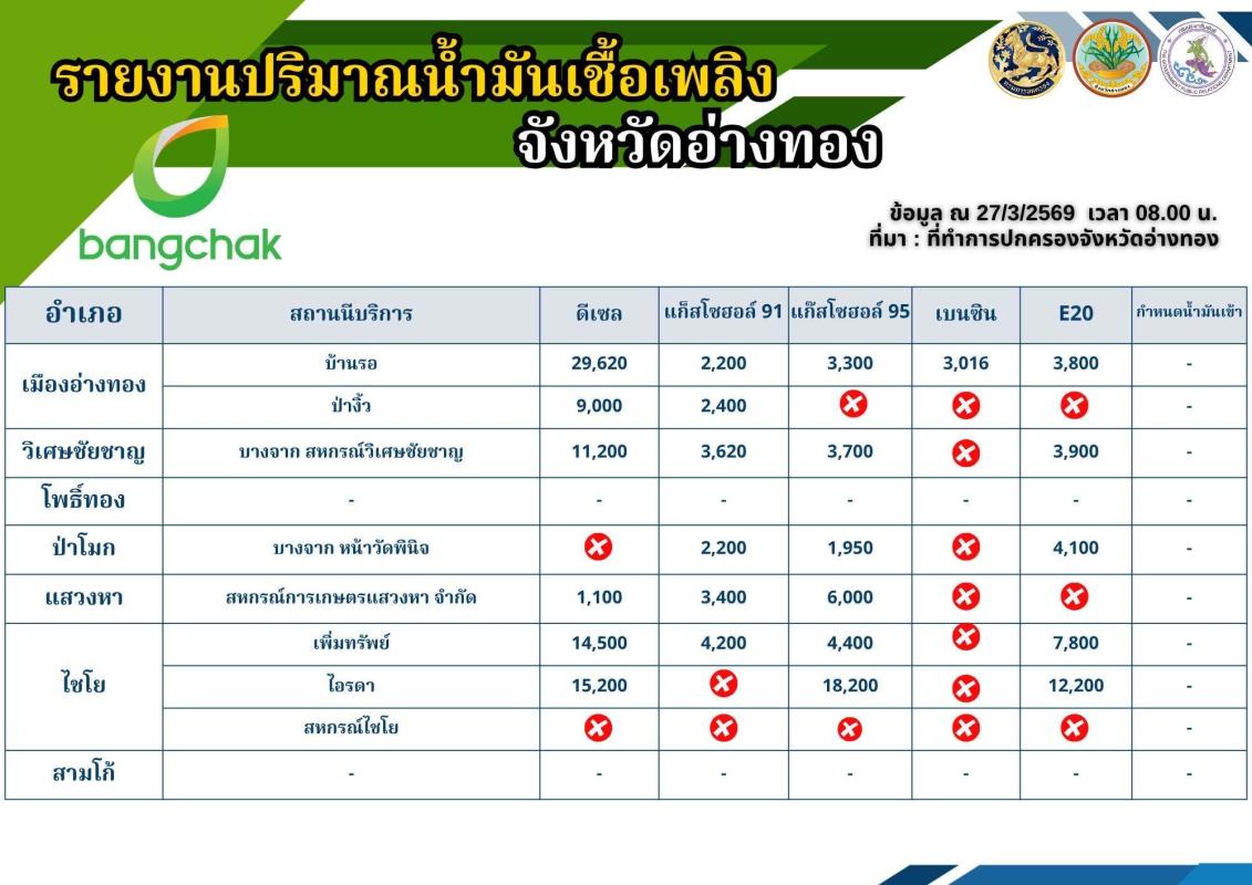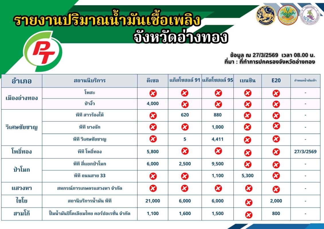 📌 ”ข้อมูลสถานีบริการน้ำมันที่ให้บริการแก่ยานพาหนะทางบก ในพื้นที่จังหวัดอ่างทอง (ณ วันที่ 27 มีนาคม 2569)“