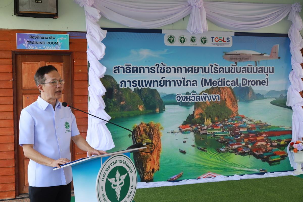 ด้าน นพ.ณัฐพงศ์ กล่าวว่า ปัจจุบันมีการใช้ Medical Drone ในหลายประเทศ เช่น สหรัฐอเมริกา สหราชอาณาจักรอังกฤษ สวิตเซอร์แลนด์ แอฟริกา อินเดีย เนปาล อินโดนีเซีย มาเลเซีย จีน เกาหลี ญี่ปุ่น สิงคโปร์ เป็นต้น ทั้งใช้ส่งของฉุกเฉินสำหรับคลินิกในพื้นที่ที่เข้าถึงได้ยาก ขนส่งยาและอุปกรณ์ทางการแพทย์ในพื้นที่ห่างไกล และขนส่งอวัยวะเพื่อการปลูกถ่ายครั้งแรกของโลกที่มหาวิทยาลัยแพทย์ในสหรัฐอเมริกา สำหรับประเทศไทย ปัจจุบันยังไม่มีผู้ให้บริการ Medical Drone ในเชิงพาณิชย์ มีเพียงบริษัทที่เคยทดสอบบินนำร่องจริงที่จังหวัดสตูล ซึ่งเทคโนโลยีของโดรนแบบ Vertical Take-off and Landing (VTOL) ขณะนี้อยู่ระหว่างการพัฒนามาตรฐานการใช้งาน โดยได้ประสานความร่วมมือกับสำนักงานการบินพลเรือนแห่งประเทศไทย เพื่อกำหนดเส้นทางบินเฉพาะด้านการแพทย์ และผลักดันให้บริการขนส่งยาด้วยโดรนสามารถอยู่ในระบบสิทธิประโยชน์การรักษาพยาบาล เพื่อให้โรงพยาบาลสามารถนำไปใช้ได้ ทั้งนี้ การทดสอบในพื้นที่จังหวัดพังงาจะดำเนินการถึงวันที่ 14 เมษายน 2569 ก่อนนำผลไปประเมินร่วมกับพื้นที่จังหวัดกระบี่และสตูล เพื่อพัฒนาเป็นต้นแบบ “Medical Drone” ที่สามารถใช้งานได้จริงในระบบสาธารณสุขของไทย