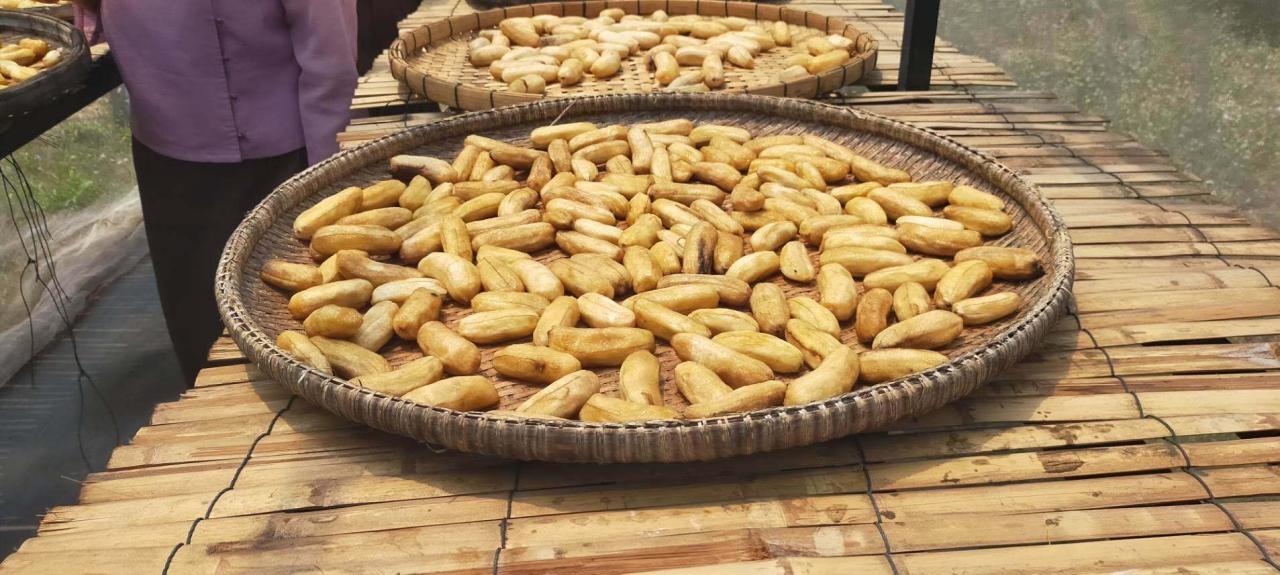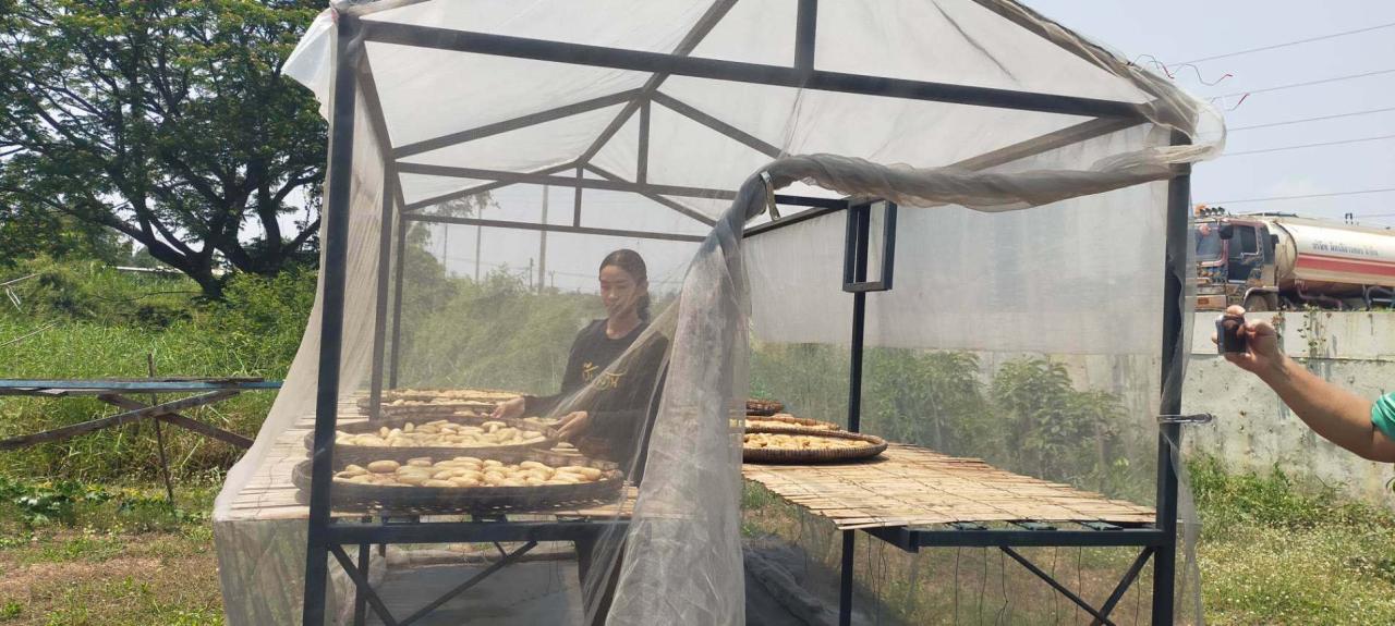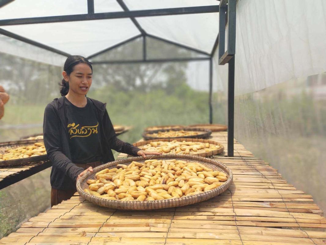 และเป็นกล้วยที่มีคุณภาพ ก็นำมาแปรรูปทำเป็นกล้วยตาก แบบวิถีธรรมชาติ แบบดั่งเดิม คือการใช้กล้วยที่ปลูกแบบเกษตรที่ปลอดภัย เป็นแนวอินทรีย์ทั้งหมด เคลือกล้วยได้ขนาดใกล้สุกและแก่คาต้นจริงๆ จึงตัดมาบ่มที่บ้านแบบธรรมชาติ ก่อนนำไปตากแดดในโรงตาก ที่ทำเป็นตาข่ายป้องกันแมลง และใช้แสงแดดในการตากกล้วย เพียงอย่างเดียว ซึ่งจะทำเป็นกล้วยหนึบด้วย กล้วยหนึบก็ทำวิธีเดียวกัน
