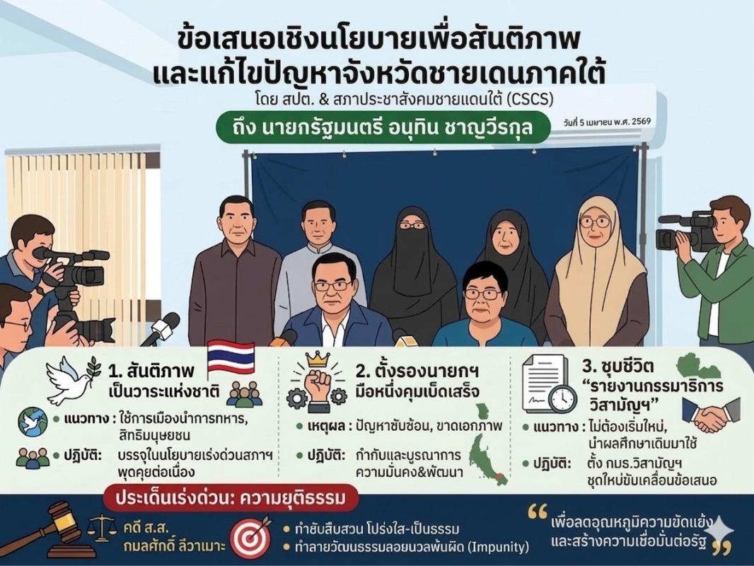 เมื่อ วันที่ 5 เมษายน พ.ศ.2569 สภาที่ปรึกษาการบริหารและการพัฒนาจังหวัดชายแดนภาคใต้ (สปต.)และสภาประชาสังคมชายแดนใต้ CSCS)แถลงข่าว เรื่องจดหมายเปิดผนึกถึงนายกรัฐมนตรี เรื่อง “การแก้ไขปัญหาจังหวัดชายแดนใต้”