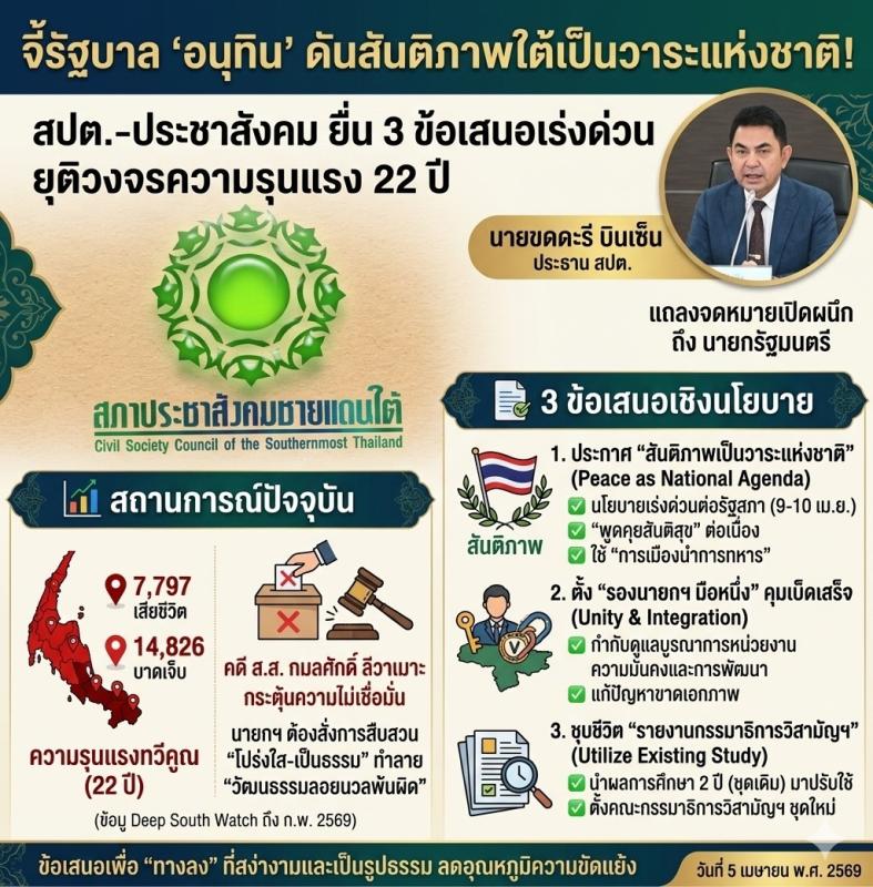 บัดนี้ รัฐบาลชุดใหม่ภายใต้การนำและขับเคลื่อนงานโดยคุณอนุทิน ชาญวีรกุล นายกรัฐมนตรี มีกำหนดแถลงนโยบายต่อรัฐสภาในระหว่างวันที่ 9 - 10 เมษายน 2569 สภาที่ปรึกษาการบริหารและการพัฒนาจังหวัดชายแดนภาคใต้ ซึ่งมีสมาชิก 49 คน มาจากผู้แทนกลุ่มอาชีพต่าง ๆ ร่วมกับสภาประชาสังคมชายแดนใต้ประกอบด้วยองค์กรสมาชิก 46 องค์กร จึงขอมีส่วนร่วมในการแก้ไขปัญหา พร้อมยืนยันเจตนารมณ์อันแน่วแน่ที่ต้องการเห็นสันติภาพเกิดขึ้นอย่างยั่งยืนในพื้นที่