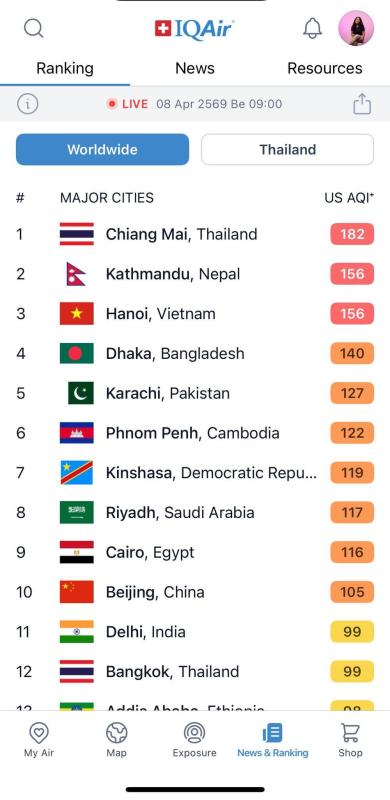 และเมื่อดูอันดับคุณภาพอากาศทั่วโลก พบว่า เชียงใหม่มีค่าคุณภาพอากาศสูงเป็นอันดับหนึ่งที่ 182 US AQI รองลงมาคือเวียดนาม ปากีสถาน บังคลาเทศ และเนปาล