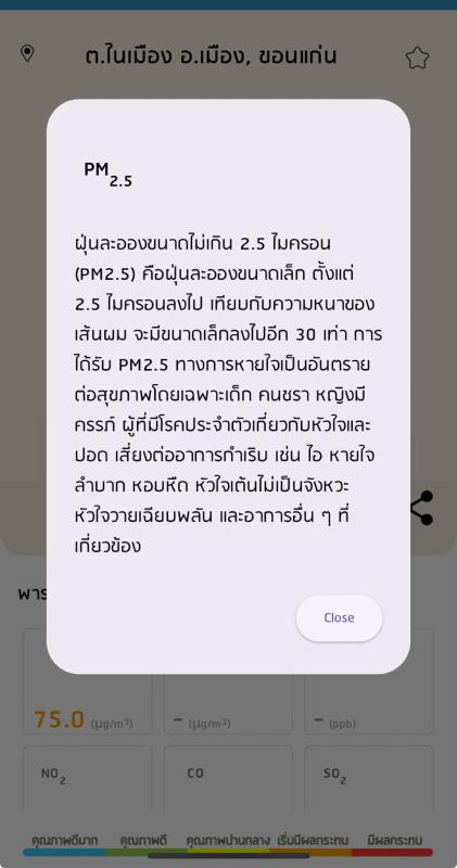 วันที่ 8 เมษายน 2569 เวลา 10.00 น. แอปพลิเคชั่น AirVisaul และ Air4Thai แสดงข้อมูลสอดคล้องกันถึงคุณภาพอากาศในพื้นที่ อ.เมือง จ.ขอนแก่น ระบุคุณภาพอากาศมีผลกระทบต่อสุขภาพ มีค่าฝุ่นขนาดจิ๋ว PM 2.5 อยู่ที่ 75 เป็นอันตรายต่อสุขภาพโดยเฉพาะ เด็ก คนชรา หญิงมีคครรภ์ ผู้มีโรคประจำตัวเกี่ยวกับหัวใจและปอด ผู้ป่วยโรคทางเดินหายใจควรหลีกเลี่ยงกิจกรรมกลางแจ้งและสวมหน้ากาก N95 ป้องกัน