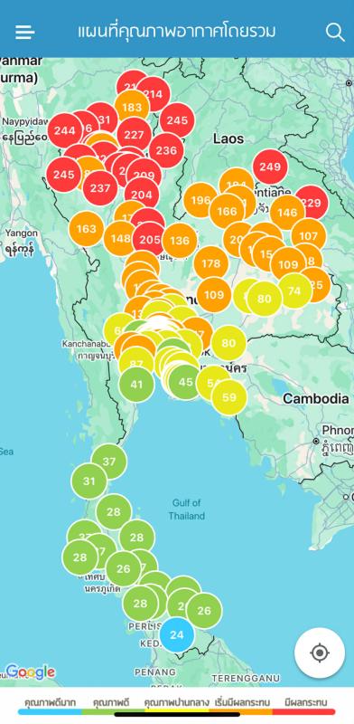 รายละเอียด แอปพลิเคชั่น Air4Thai แสดงข้อมูลคุณภาพอากาศให้เห็นว่าในภาคอีสาน หลายพื้นที่คุณภาพอากาศเป็นสีส้ม และพิกัดพื้นที่ จ.บึงกาฬ มีค่าคุณภาพอากาศสีแดงอยู่ที่ 249 AQI และ จ.นครพนม อยู่ที่ 229 AQI