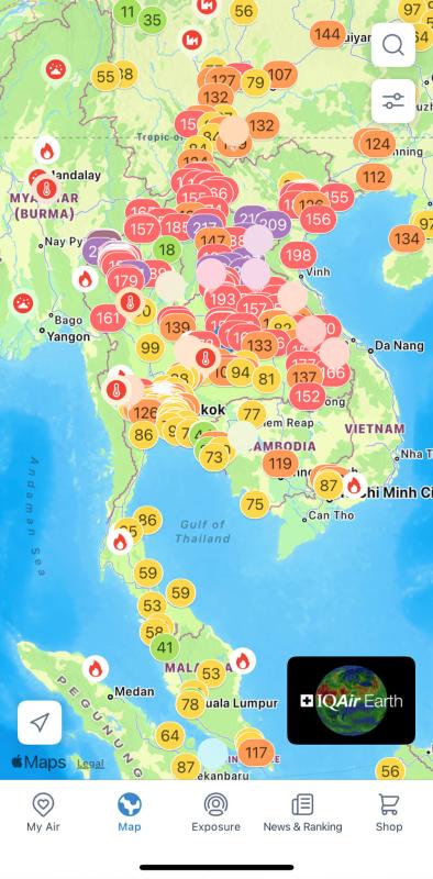 ขณะที่ แอปพลิเคชั่น AirVisaul ซึ่งให้ข้อมูลเรียลไทม์และพยากรณ์ล่วงหน้า ครอบคลุมกว่า 500,000 สถานที่ทั่วโลก แสดข้อมูลคุณภาพอากาศในภาคอีสานแสดงให้เห็นว่าหลายพิกัดมีค่าอากาศเป็นสีแดง โดยขอนแก่นอยู่ที่ 156 US AQI ส่งผลกระทบต่อสุขภาพ เช่นเดียวกับผลที่แสดงจากสถานีตรวจวัดใน จ. อุดรธานี หนองคาย สกลนคร อำนาจเจริญที่มีค่าอากาศเป็นสีแดง และแสดงพิกัดสีม่วงในพื้นที่ จ.บึงกาฬ 255 US AQI และเมืองปากซัน ของ สปป.ลาว 236 US AQI