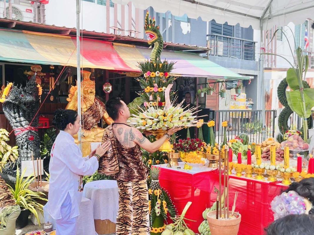 โดยมี อาจารย์หมอตี๋ปากน้ำ (โหราผู้ประกอบพิธี) พร้อม คณะศิษย์ยานุศิษย์ร่วมพิธีเป็นจำนวนมาก ภายในพิธีบวงสรวงไหว้ครู ขณะกล่าวโองการเชิญเทพ มีคณะศิษย์ยานุศิษย์ เหมือนมีองค์ลงหน้าตาท่าทางขลึงขัง ร่ายรำสวยสง่า ทุกๆปีจะจัดงานใหญ่ๆแบบนี้ตลอดทุกๆปี