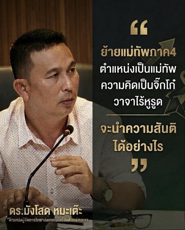 > **"ย้ายแม่ทัพภาค 4 ตำแหน่งเป็นแม่ทัพ ความคิดเป็นจิ๊กโก๋ วาจาไร้หูรูด จะนำความสันติได้อย่างไร"** — ดร.มังโสด หมะเต๊ะ กล่าว