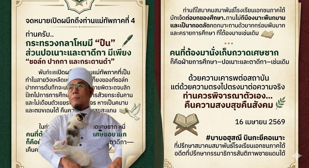 **สงขลา** – เมื่อวันที่ 16 เมษายน 2569 บาบอฮุสณี บินกะยีคอเนาะ ในฐานะที่ปรึกษาสมาคมสมาพันธ์โรงเรียนเอกชนภาคใต้ และอดีตที่ปรึกษากรรมาธิการสันติภาพชายแดนใต้ ได้เผยแพร่จดหมายเปิดผนึกถึงแม่ทัพภาคที่ 4 เพื่อสะท้อนมุมมองต่อการดำเนินนโยบายความมั่นคงในพื้นที่จังหวัดชายแดนภาคใต้ โดยเน้นย้ำถึงความแตกต่างระหว่างอำนาจบังคับใช้กฎหมายและพลังของการศึกษา