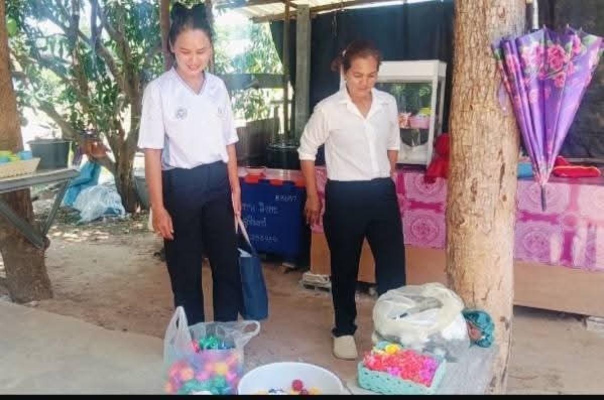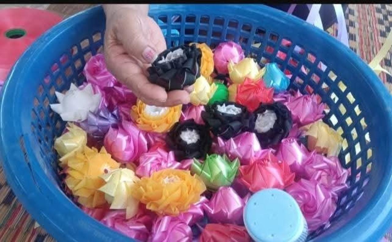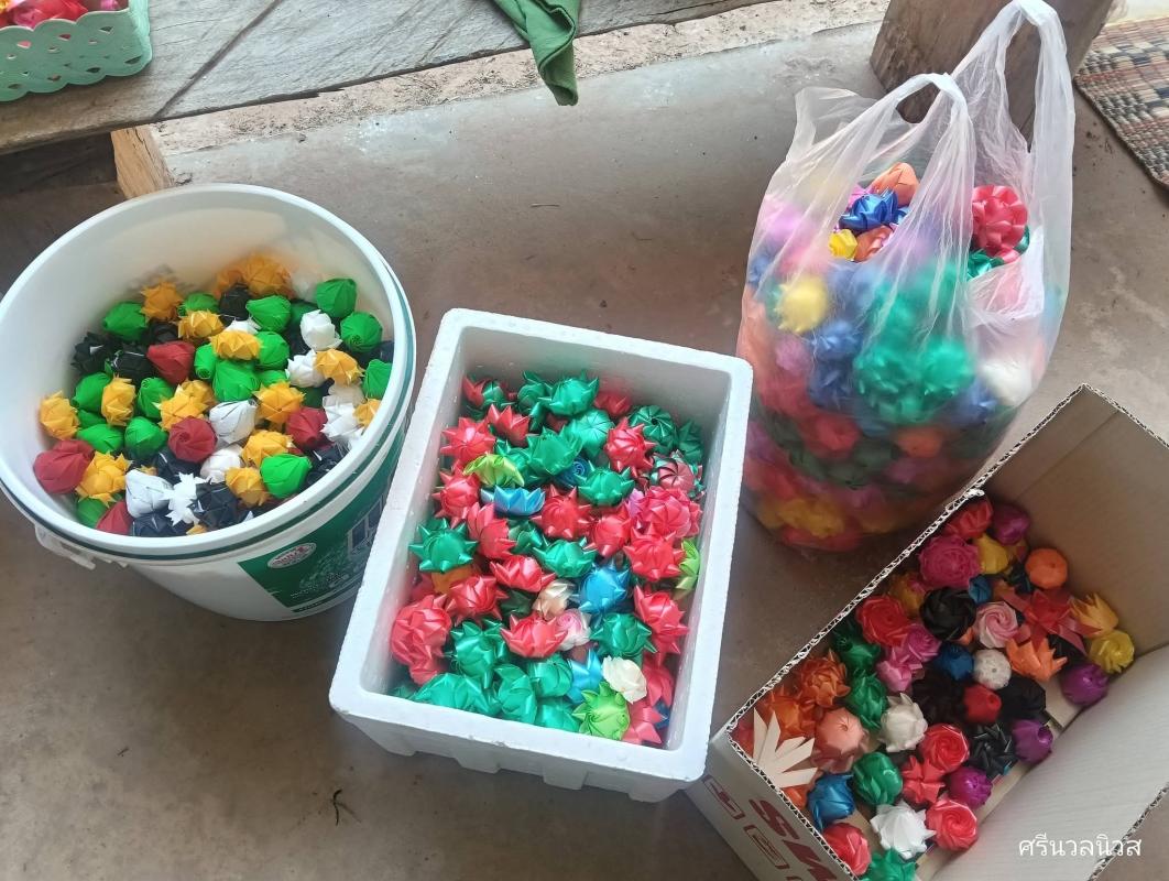 สุรินทร์ : #พับริบบิ้นเหรียญโปรยทานนั่งทำอยู่ที่บ้านรายได้เริ่ด