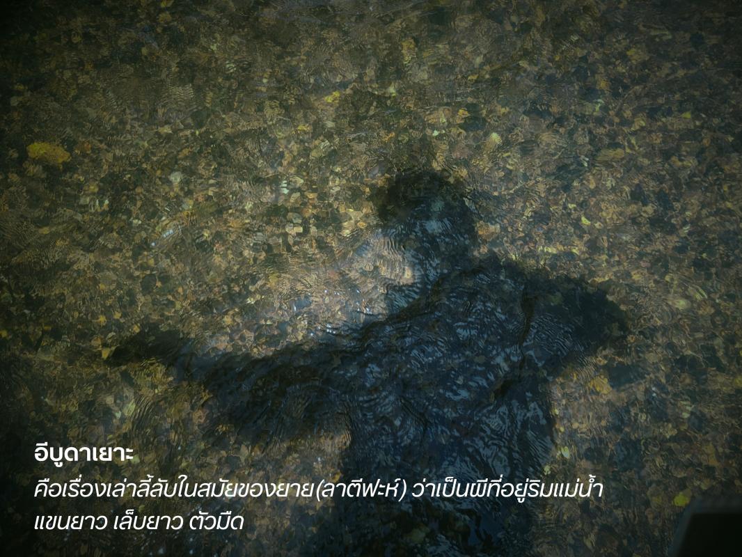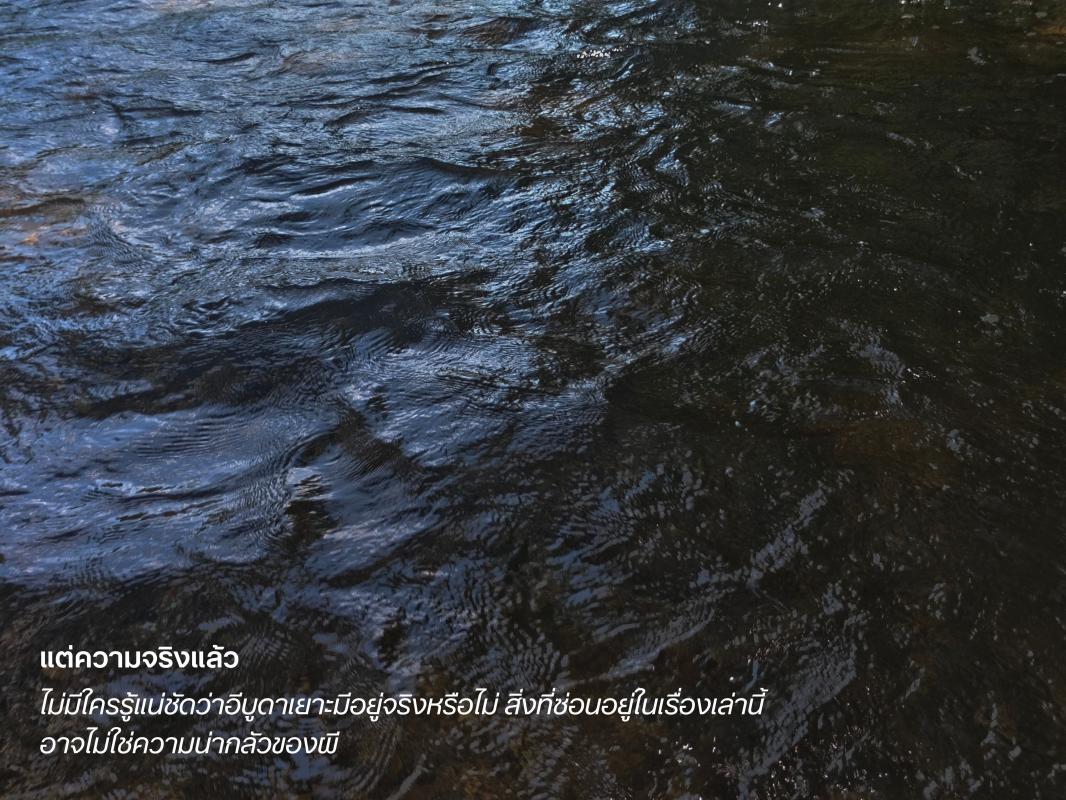 แต่ความจริงแล้ว ไม่มีใครรู้แน่ชัดว่าอีบูดาเยาะมีอยู่จริงหรือไม่ สิ่งที่ซ่อนอยู่ในเรื่องเล่านี้ อาจไม่ใช่ความน่ากลัวของผี หากแต่เป็นความห่วงใยของคนเป็นแม่ ที่กลัวลูกจะพลัดตกลงไปในจุดน้ำลึกของแม่น้ำ เมื่อเวลาผ่านไป เรื่องเล่าเหล่านี้ค่อยๆ เลือนหาย แม่น้ำที่เคยน่ากลัว กลับกลายเป็นพื้นที่ของความสุข เป็นที่ที่เด็กๆ มารวมตัวเล่นน้ำ หัวเราะ และใช้เวลาร่วมกัน ราวกับเป็นวิมานบนดินที่ปล่อยให้จินตนาการล่องลอยไปตามสายน้ำ