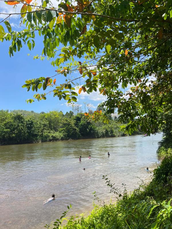 คนรุ่นใหม่ลงไปอยู่ในน้ำ ยืน สังเกต จับต้อง เหมือนกำลัง เรียนรู้ หรือ สำรวจ แม่น้ำด้วยตัวเอง บรรยากาศดูสงบ ธรรมชาติยังดูมีชีวิต แต่ก็แฝงความเปราะบางน้ำที่ขุ่นนิดๆ แนวพืชที่ขึ้นตามตลิ่ง บอกว่าระบบนิเวศกำลังเปลี่ยนไป