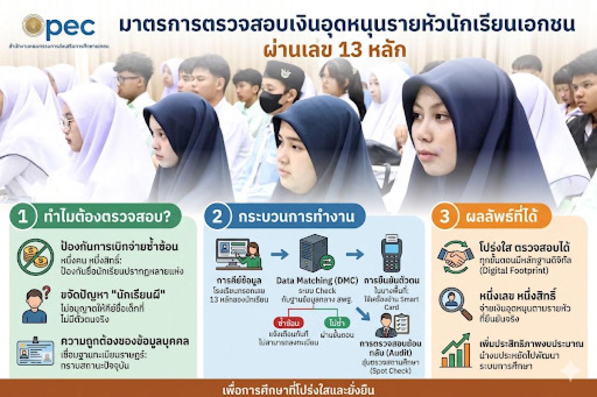 “ระบบการตรวจสอบเงินอุดหนุนรายหัวนักเรียนโรงงานเอกชนสอนศาสนาอิสลามและเอกชนสามัญโดยใช้เลขบัตรประชาชน 13 หลัก เป็นมาตรการสำคัญของกระทรวงศึกษาธิการ (โดยเฉพาะสำนักงานคณะกรรมการส่งเสริมการศึกษาเอกชน หรือ สช.) เพื่อสร้างความโปร่งใสและเพิ่มประสิทธิภาพในการใช้งบประมาณแผ่นดินในทุกๆเดือน