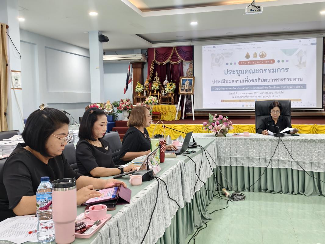 วันที่ 24 เมษายน 2569 นางสุริยา เครือรัตน์ ผอ.สพป.สุราษฎร์ธานี เขต 3 มอบหมายให้นางสาวสารีย์ นุ่มนวล ศึกษานิเทศก์ฯ กลุ่มนิเทศติดตาม และประเมินผลการจัดการศึกษา เป็นประธานการประชุมคณะกรรมการประเมินผลงานโรงเรียนที่เข้าร่วมโครงการบ้านนักวิทยาศาสตร์น้อย ประเทศไทย ระดับประศึกษา เพื่อขอรับตราพระราชทาน “บ้านนักวิทยาศาสตร์น้อย ประเทศไทย” ปีการศึกษา 2568 . ณ ห้องประชุมศรีสุราษฎร์ โดยมีโรงเรียนที่มีคุณสมบัติประสงค์เข้ารับการประเมินจำนวน 51 โรงเรียน ได้แก่ โรงเรียนที่เข้าร่วมโครงการ รุ่นที่ 1 จำนวน 18 โรงเรียน (ประเมินรอบที่ 2 เพื่อคงสภาพตราพระราชทาน ครั้งที่ 1) และโรงเรียนที่เข้าร่วมโครงการ รุ่นที่ 4 จำนวน 33 โรงเรียน (ประเมินรอบที่ 1 เพื่อขอรับตราพระราชทาน ครั้งที่ 1)